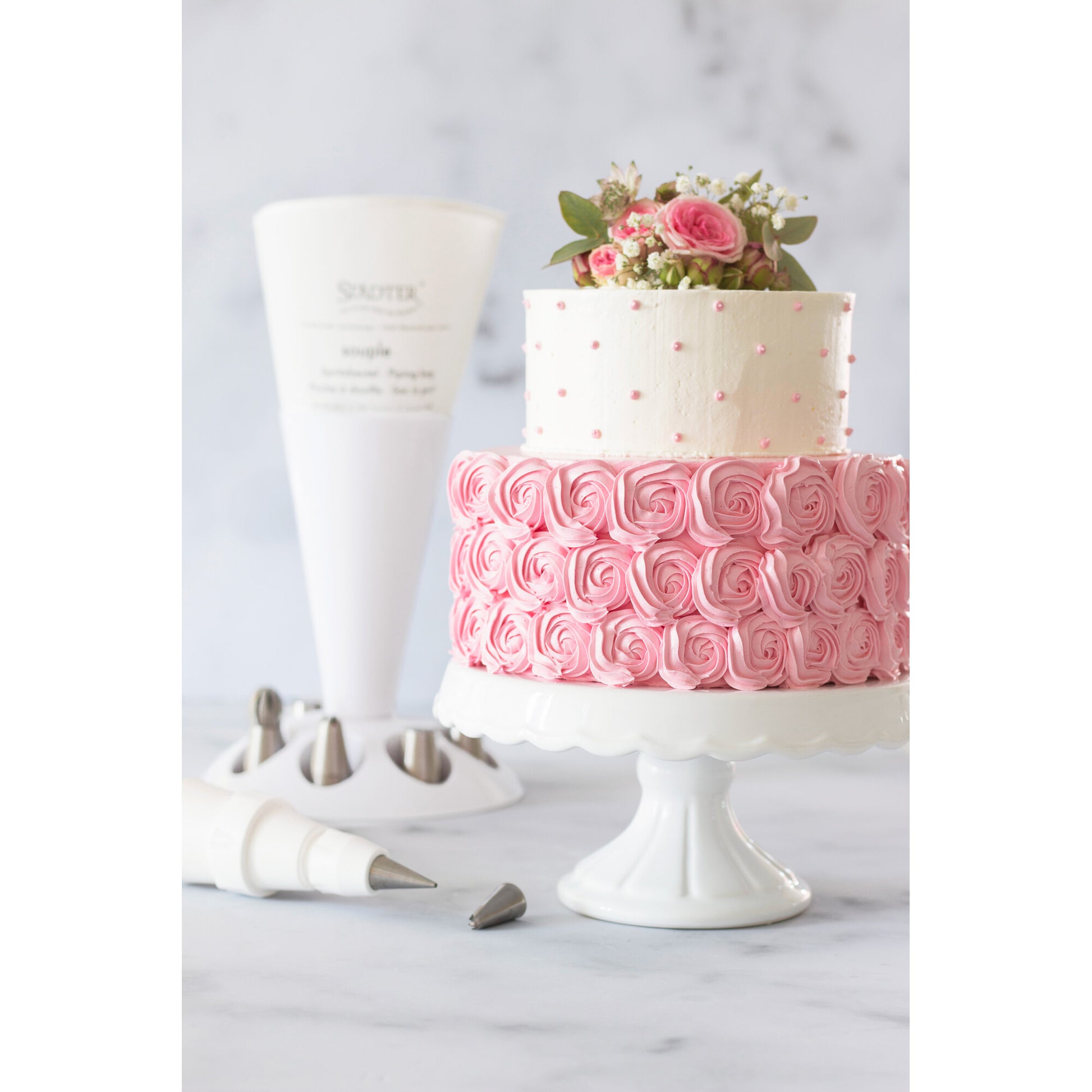 Ein cleverer Helfer beim Arbeiten mit Spritzbeutel. Nutzen Sie den Absetzständer beim: – Einfüllen der Spritzmasse – Absetzen zwischen den Spritzvorgängen – Trocknen des Spritzbeutels nach der Reinigung.