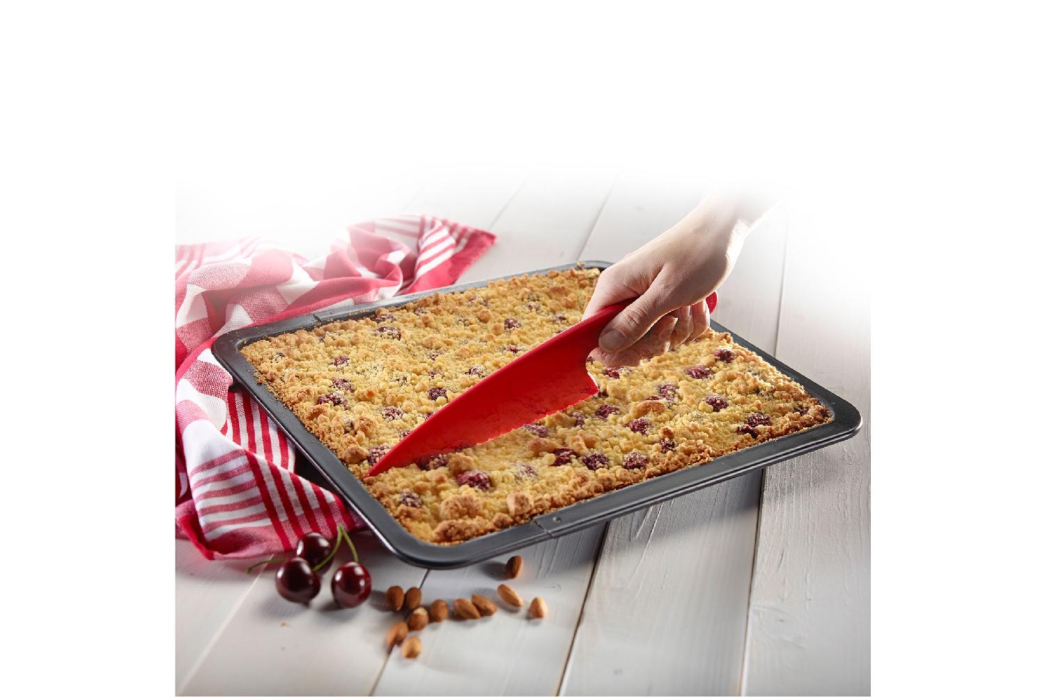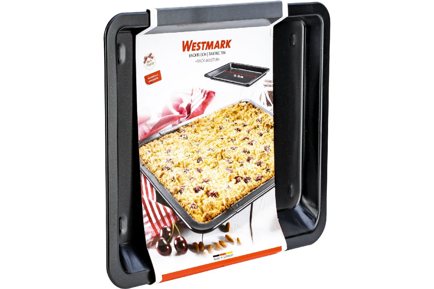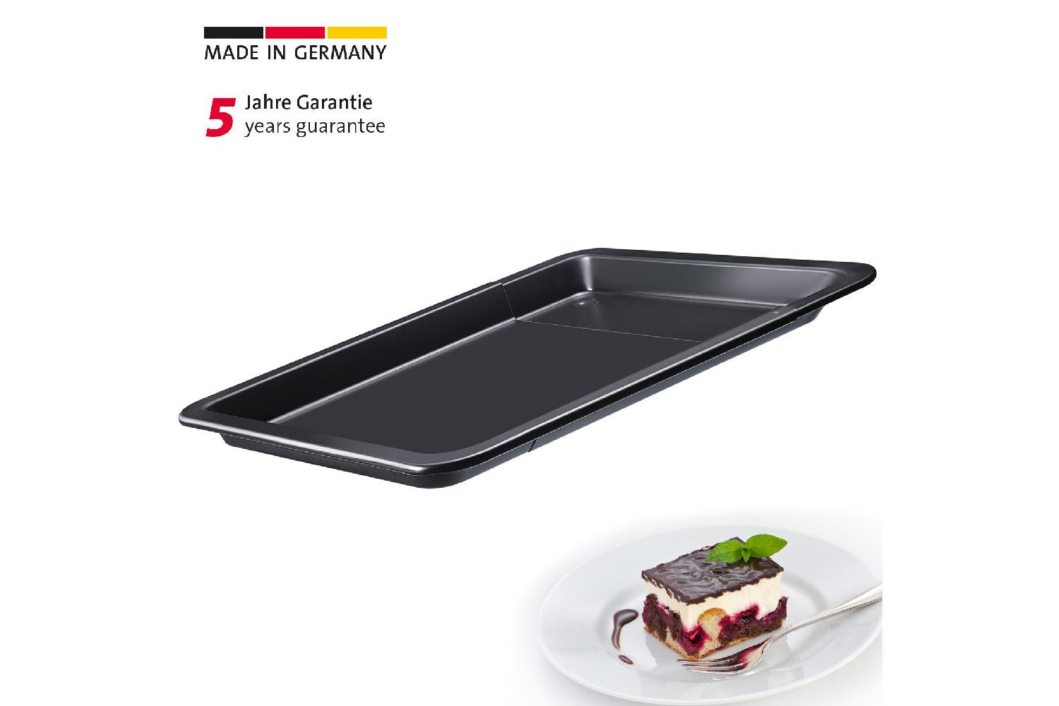 Das Backblech lässt sich von 33 - 53 cm in der Länge ausziehen und ist somit hervorragend bei variablem Platzbedarf einsetzbar. Für den Garvorgang wird das Blech einfach auf das im Ofen befindliche Backrost gestellt und Pizza, Kuchen, Salzbraten und Co. können nun schön knusprig werden. Die hochwertige Antihaftbeschichtung sorgt dafür, dass sich die Speisen bei nur geringem Fetteinsatz leicht von der Oberfläche ablösen lassen. Die Reinigung erfolgt - wie bei allen beschichteten Backformen und -blechen einfach per Hand.Handwäsche empfohlen, Made in Germany, 5 Jahre Garantie