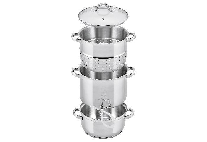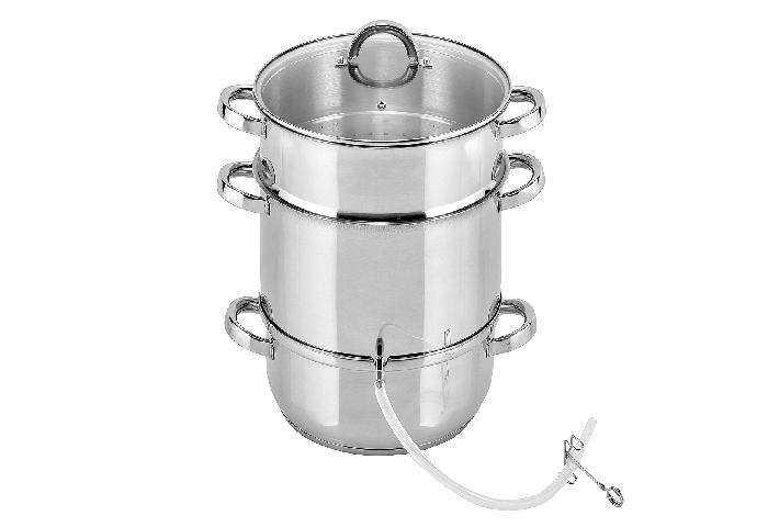 Edelstahl 18/8 - 18/10, Wandstärke ca. 0,6 mm, verkapselter Sandwichboden 3,6 mm, innen und außen hochglanzpoliert, Edelstahlhohlgriffe, Glasdeckel mit stoßfestem Edelstahlrand, Edelstahlgriff und Entlüftungsloch, Entsafter-Einsatz, Fruchtkorb 7 l, Ø 26 cm, H 15,5 cm, Wasserbehälter 3,8 l, Ø 24 cm, H 11 cm, Silikonschlauch, EDS Clip und Verschluss, spülmaschinengeeignet, für alle Herdarten geeignet, auch für Induktion