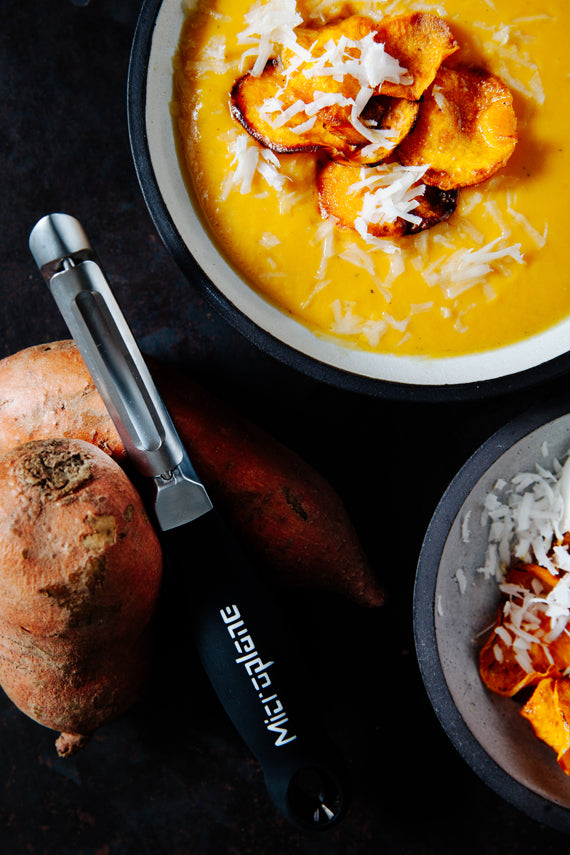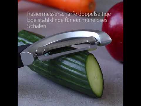 | Der neue Profi-Schäler mit rasiermesser-scharfer, doppelseitiger Edelstahlklinge überzeugt beim Schälen nicht nur durch seine Schärfe, sondern auch durch seine vielseitige Funktionalität. Mit ihm lassen sich sowohl weiche wie harte Lebensmittel hauchdünn schälen. Ob Karotten, Gurken, Zucchini, Kartoffeln, Spargel, Pastinaken, Kiwis, Mangos oder Äpfel – die bewegliche Klinge passt sich der unterschiedlichen Obst - und Gemüseform optimal an. Auch, wenn Gerichte mit dünnen Obst- und Gemüsestreifen garniert werden sollen, kommt diese einzigartige Klingenschärfe wie gerufen. Darüber hinaus kann in beide Richtungen geschält werden. Dank der doppelseitigen, beweglichen Klinge lassen sich die Lebensmittel sowohl rauf wie runter schälen und dies in einer Bewegung. Der ergonomisch geformte Soft-Touch Griff liegt optimal in der Hand und eignet sich auch für Rechts- wie Linkshänder. Eine abgeflachte Fläche am oberen Griff sorgt dafür, dass der Daumen hier angenehm auf dem Griff liegt, so dass auch längeres Schälen kein Problem ist. Und sollte einmal ein Kartoffelauge entfernt werden müssen, alles kein Problem. Am Schälerkopf befindet sich ein Entferner, mit dem sich die entsprechende Stelle großzügig herausschneiden lässt. |
