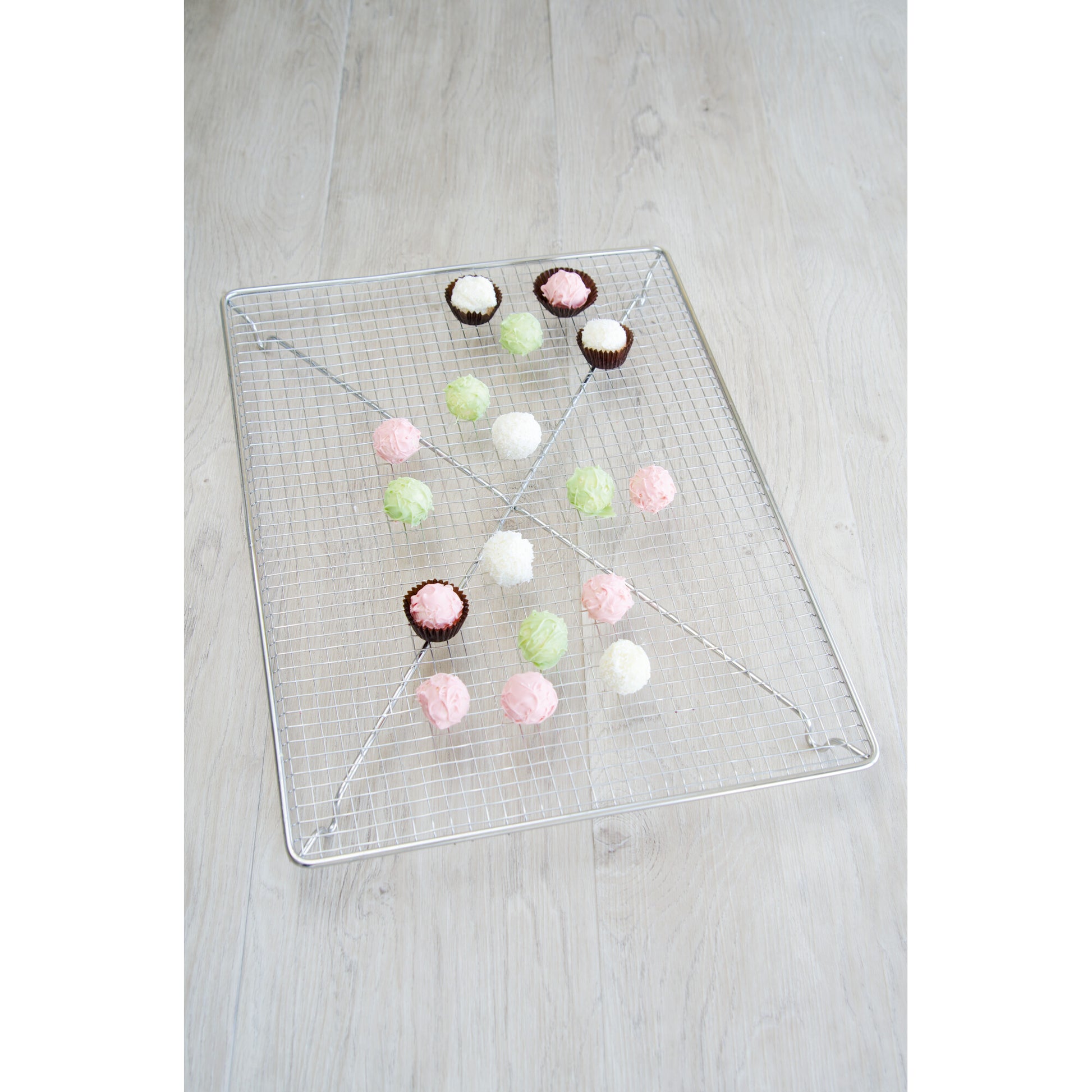 Nützlicher Helfer für das Auskühlen von Kuchen und Tortenböden, aber auch beim Dekorieren von Keksen und ausarbeiten von Pralinen. Überschüssiger Guss tropft auf die Arbeitsplatte und bleibt nicht am Gebäck hängen.