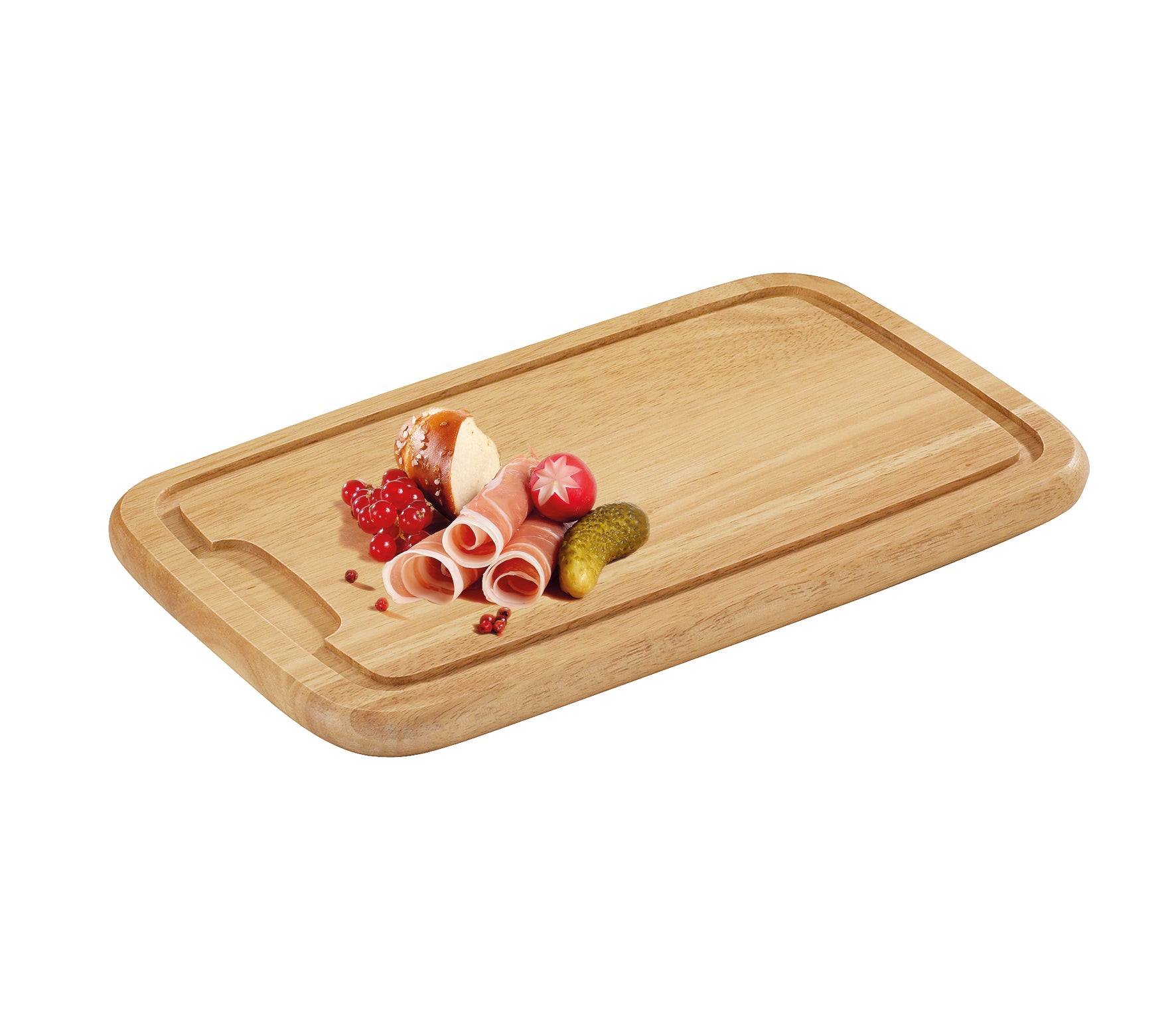Davon kann sich so manches Tranchierbrett eine Scheibe abschneiden. Das Brett im zeitlosen Design ist hart im Nehmen, denn das Gummibaumholz aus nachhaltigem Plantagenanbau ist robust und langlebig. Das Brett ist griffig und massiv und verfügt über eine Saftrille – ideal zum Tranchieren von Fleisch. Zur deftigen Brotzeit eignet sich das Brett ebenso gut zum dekorativen Präsentieren von Käse oder Schinken.